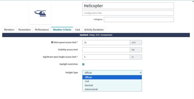 Helicopter daylight settings control when helicopter operations are permitted based on available daylight. This is a critical safety constraint for offshore wind farm operations.