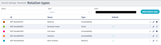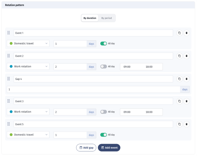 - Create a rotation by defining shifts, days off, or travel periods for selected personnel.